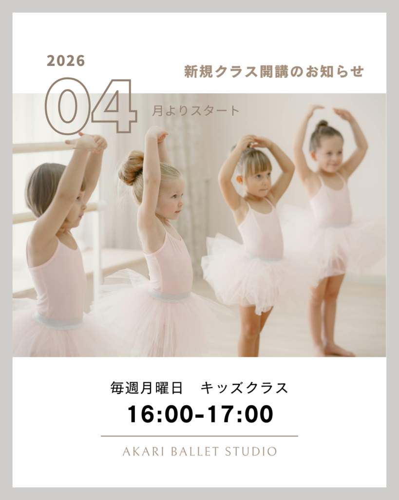 新規キッズクラス開講のお知らせ 2026.04.02 最終更新日時 : 2026.04.02 akari-admin お知らせ2026.04.02 4月より、新しくキッズクラスを開講いたします。 ■月曜日 16:00〜17:00 少人数でのスタートとなるため、はじめての習い事としても安心してご参加いただけます✨それぞれのペースに寄り添いながら、「楽しい」「できた」という気持ちを大切にレッスンを進めていきます。 小さな「できた!」の積み重ねが、自信や意欲につながり、成長へと繋がっていきます🩰 体験レッスンも随時承っておりますので、ご希望の方はHPよりお気軽にお問い合わせください✨